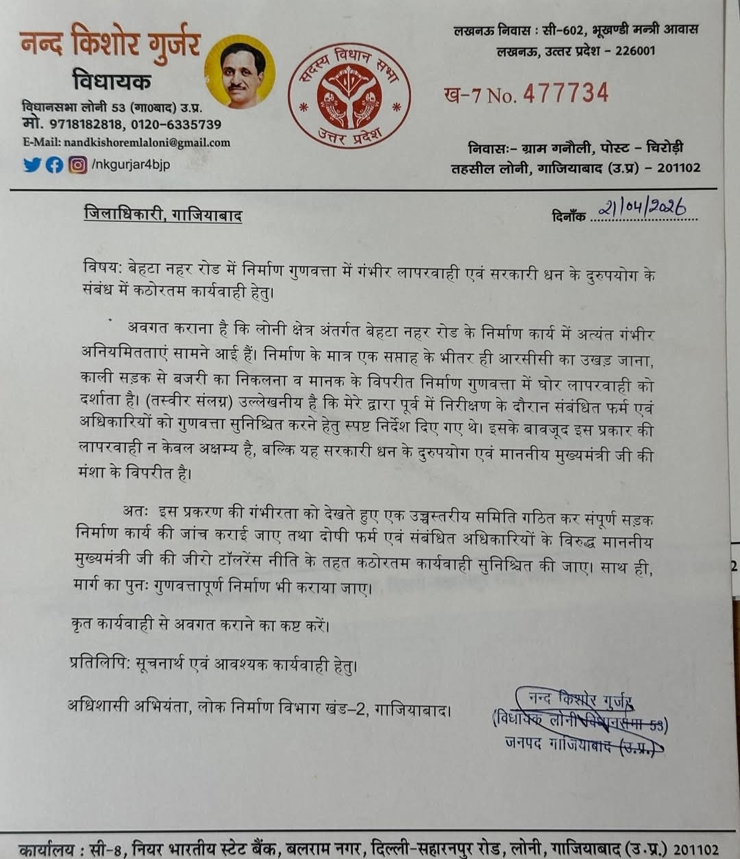 लोनी क्षेत्र में विकास कार्यों की गुणवत्ता को लेकर एक बार फिर बड़ा सवाल खड़ा हो गया है। क्षेत्रीय विधायक नंदकिशोर गुर्जर ने बेहटा नहर रोड के निर्माण में गंभीर लापरवाही, घटिया गुणवत्ता और सरकारी धन के दुरुपयोग का आरोप लगाते हुए जिलाधिकारी गाजियाबाद को औपचारिक शिकायत भेजी है। इस मामले को जनहित से जुड़ा बताते हुए उन्होंने कड़ी कार्रवाई और उच्चस्तरीय जांच की मांग की है।