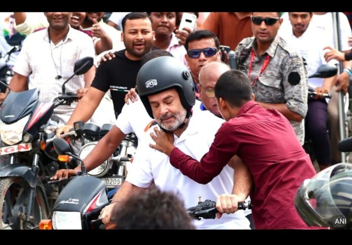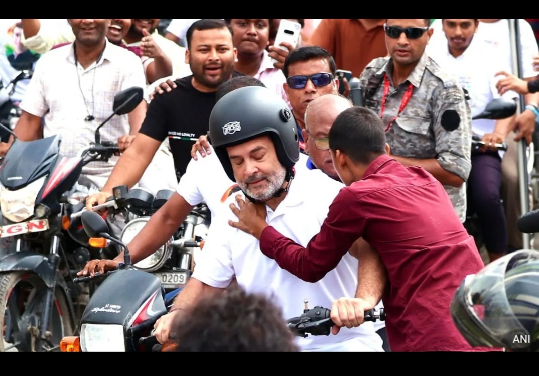 राजनीतिक दृश्य: राहुल गांधी ने खुले जीप और मोटरसाइकिल रैली के माध्यम से जनता से सीधे संवाद स्थापित किया, जिसमें उनकी बहन प्रियंका गांधी व उनके साथ साइकिल चलाने वाले नेता शामिल थे।
