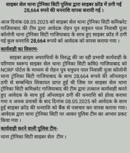 साइबर सेल थाना ट्रोनिका सिटी पुलिस द्वारा साइबर फ्रॉड में ठगी गई 28,664 रुपये की धनराशि वापस करायी गई ।साइबर सेल थाना ट्रोनिका सिटी पुलिस द्वारा साइबर फ्रॉड में ठगी गई 28,664 रुपये की धनराशि वापस करायी गई ।