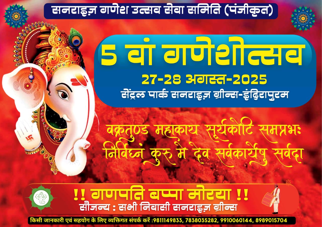 गाजियाबाद। इंदिरापुरम स्थित सनराइज ग्रीन सोसाइटी में इस वर्ष पाँचवाँ गणेश चतुर्थी उत्सव बड़े ही हर्षोल्लास और श्रद्धा के साथ मनाया जाएगा। कार्यक्रम का शुभारंभ 27 अगस्त को भगवान श्री गणेश जी की प्रतिमा स्थापना से होगा।