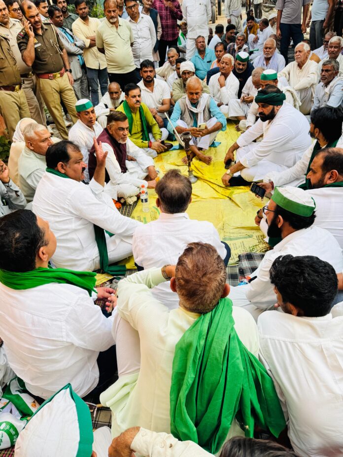 मंडोला विहार योजना से प्रभावित किसानों का धरना तहसील परिसर में दूसरे दिन भी जारी